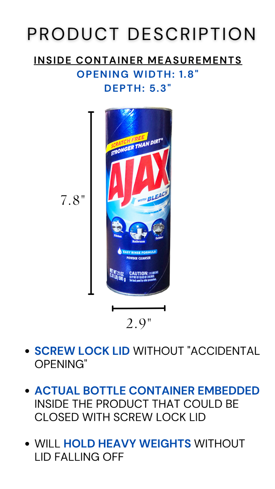 Keep your valuables secure and hidden in plain sight with the Ajax Diversion Safe. Designed to look and feel just like a real Ajax cleaner can, this clever stash safe features a screw-lock bottom compartment that’s perfect for storing cash, jewelry, keys, or other small personal items.