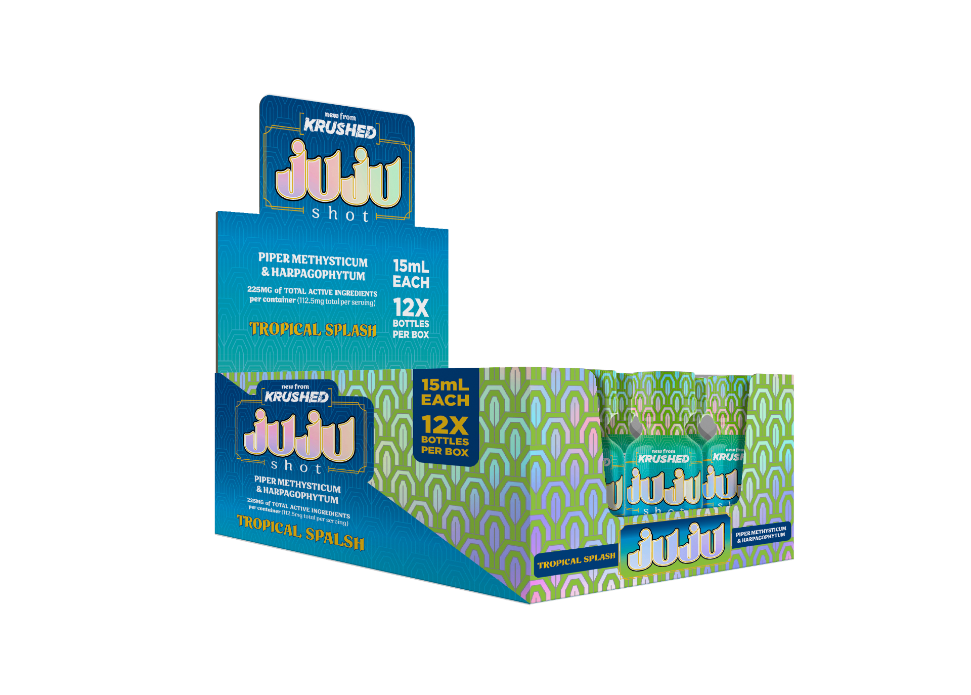 JUJU – Tropical Splash Full Box (12 Bottles) is designed for those who want consistent access to a smooth, fast-acting relaxation experience. Each bottle features a powerful proprietary blend of Piper Methysticum (Kava) and Harpagophytum (Devil’s Claw), paired with a refreshing tropical flavor.