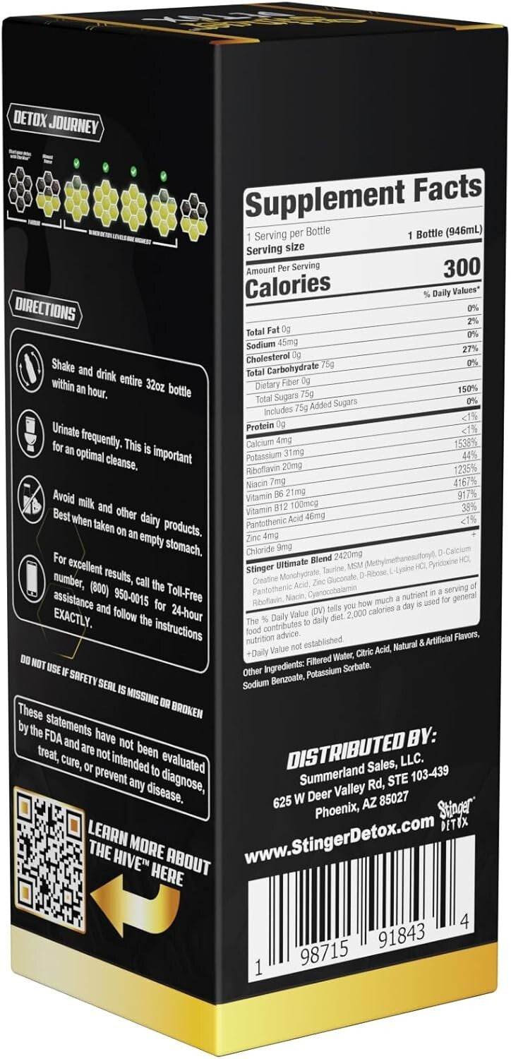 Stinger Detox The Hive Same Day Cleanse is designed for those who want a fast-acting, same-day detox support option in a convenient liquid format. Formulated with a blend of vitamins, minerals, and botanical components, The Hive supports your body’s natural cleansing processes while helping maintain hydration and balance.